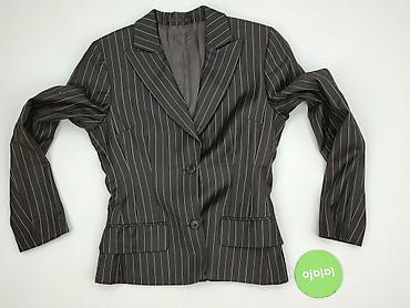 Marynarka damska w paski, rozmiar S. - Fason: jednorzędowa, zapinana na 2 guziki - Kolor: odcienie grafitu/szarości w pionowe pasy - Kieszenie: dwie naszywane z przodu + kieszonka na piersi - Nasz...