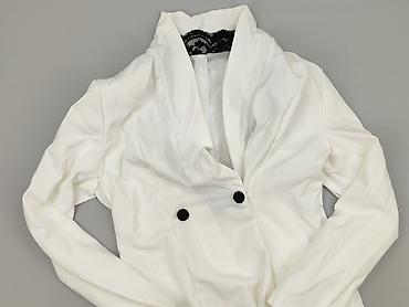 Żakiet damski, biały, rozpinany na trzy czarne guziki z przodu. Fason z szerokim, miękko układającym się kołnierzem/szalowym wyłogiem, dopasowany w talii, długie rękawy. Gładki tył z modelującymi przeszyciami.