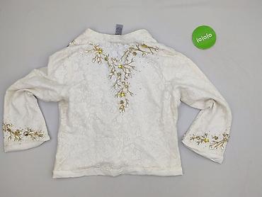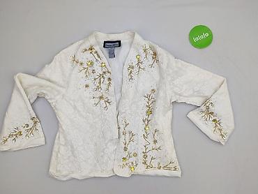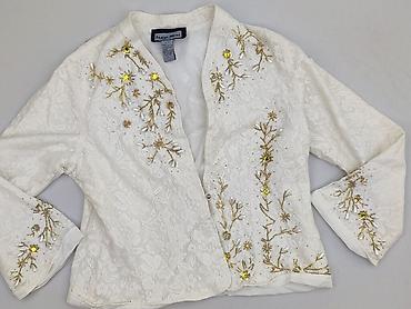Elegancki, lekki żakiet z koronkowej tkaniny bawełnianej, ozdobiony ręcznie wykańczanym haftem roślinnym w odcieniach złota oraz aplikacjami z cekinów i paciorków. Zdobienia umieszczone z przodu po obu stronach zapięcia, na mankietach oraz na plecach. Dekolt w kształcie litery V, przód zapinany na guziki. Rękawy o lekko rozszerzanym kroju 3/4, miękko układające się. Delikatna, gładka podszewka zapewnia komfort noszenia. Świetna propozycja do stylizacji wieczorowych i okazjonalnych.