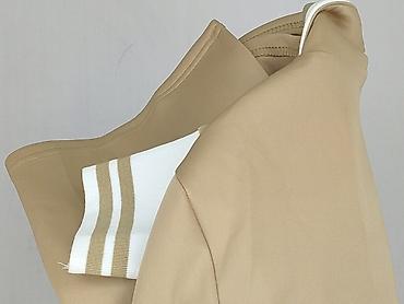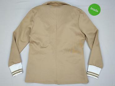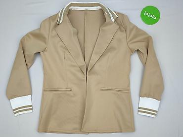 Beżowa marynarka damska, rozmiar L - Krój: klasyczny żakiet z kołnierzem z klapami - Zapięcie: jeden guzik z przodu (biały) - Rękawy: 3/4 z szerokim mankietem - Kieszenie: dwie duże naszywane kies...
