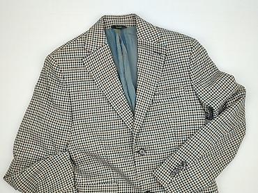 Marynarka męska Summer-cha - Krój: jednorzędowa, 3‑guzikowa - Klapy: klasyczne, otwarte - Materiał: 80% wełna, 20% poliester (na metce) - Podszewka: jasna, gładka - Wzór: szara tkanina w delikatne...