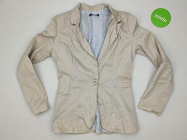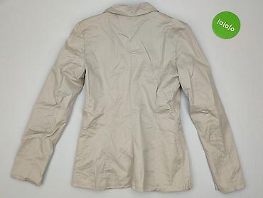 Beżowa marynarka damska „Made in Italy” - Krój: jednorzędowy, zapinany na 1 guzik - Kołnierz: klasyczne, ostre klapy - Kieszenie: dwie poziome, wpuszczane (bez klap) - Tkanina z metki: 80% poliest...Stan: