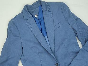 Damska marynarka w odcieniach niebieskiego, w drobny skośny prążek. Taliowany krój z klasycznymi klapami, zapinana na jeden guzik z przodu. Dwie duże naszywane kieszenie po bokach oraz brustasza. Rękawy z trzema guzikami przy mankietach. Z tyłu modelujące przeszycia. Wnętrze z gładką, niebieską podszewką.