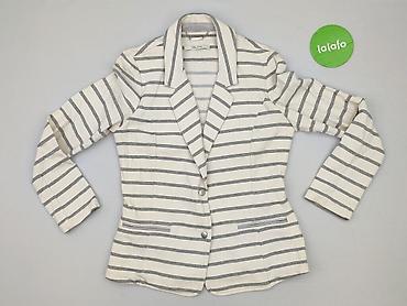 Marynarka damska w paski, rozmiar S. - Fason: jednorzędowa, zapinana na 2 guziki - Kolor: odcienie grafitu/szarości w pionowe pasy - Kieszenie: dwie naszywane z przodu + kieszonka na piersi - Nasz...