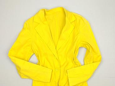 Żakiet damski, intensywnie żółty - Krój: taliowany, krótszy, zmodelowane przeszycia wysmuklające sylwetkę - Zapięcie: jeden duży guzik z przodu - Kołnierz: szeroki, z klapami - Rękawy: długie - Ma...