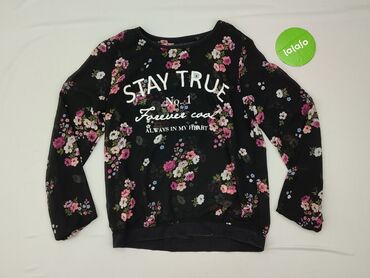 Damska bluza z długim rękawem, czarna w wielobarwny, drobny wzór kwiatowy. Na przodzie nadruk napisów: “STAY TRUE No.1 Forever cool ALWAYS IN MY HEART”.