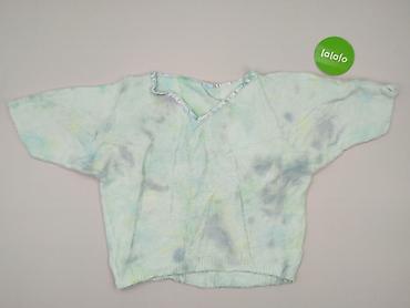 Bluza damska z miękkiej, puszystej dzianiny, w odcieniach miętowej zieleni z subtelnym, rozmytym wzorem tie-dye (pastelowe akcenty szarości, błękitu i żółci). Luźny krój z obniżoną linią ramion i bardzo szerokimi rękawami typu nietoperz/dolman. Dekolt w kształcie litery V wykończony połyskującą lamówką w kolorze jasnego błękitu. Dół zakończony delikatnym ściągaczem, który nadaje formę oversize’owej sylwetce.