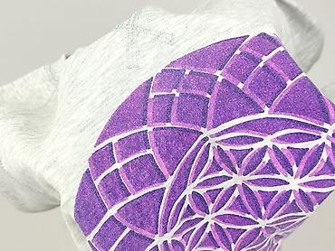 - Nadruk: duży, fioletowy, geometryczny motyw na piersi