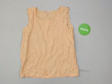 Bluzka damska bez rękawów w kolorze brzoskwiniowym. - Fason: luźny, z falbanami przy ramionach i delikatnym dekoltem w kształcie litery U/V (łagodnie zaokrąglony przód). - Materiał: lekki, zwiewny...Stan: