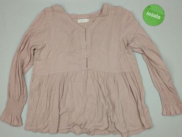 Bluzka damska w kolorze jasnoróżowym (pastelowy pudrowy róż). - Krój: luźny, lekko przedłużony tył (zaokrąglony dół). - Dekolt: łódka z krótką listwą guzikową (4 perłowe guziki). - Rękawy: 3/4 z m...