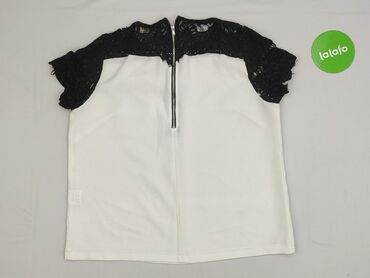 Biała, lekka bluzka damska z koronkowymi wstawkami. - Krój: luźny, nietoperz/dolman z obniżoną linią ramion - Dekolt: w serek z krótką listwą guzikową (3 guziki) - Rękawy: krótkie, podwinięte - De...