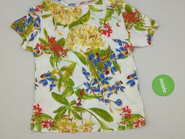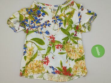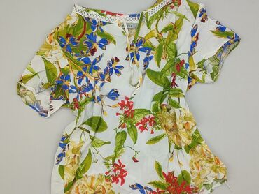 Bluzka damska w kwiaty z krótkim rękawem - Krój: luźny, koszulowy; kołnierz z klapami, zapięcie na guziki z przodu; lekko zaokrąglony dół. - Rękaw: krótki, swobodny. - Wzór: wielobarwny nadruk kwi...Stan: