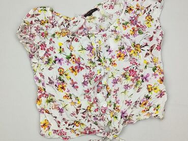 Bluzka damska AMISU (New Yorker) – rozmiar XS - Fason: krótka bluzka z peplum, dekolt typu carmen/łódka, bufiaste rękawy do łokcia z gumką - Wzór: intensywny, kwiatowy print na czarnym tle (odcien...