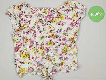 Bluzka damska AMISU, rozmiar S. - Krój: krótka (crop), dekolt w kształcie litery V z węzłem/zawiązaniem na przodzie, lekko marszczony dół z elastyczną gumką. - Rękawy: długie, bufiaste, zakończon...