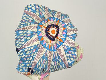 - Przód: jedwabny panel z efektownym, wielobarwnym nadrukiem mandali w odcieniach niebieskiego, różu, pomarańczu i beżu; kontrastowe lamówki.