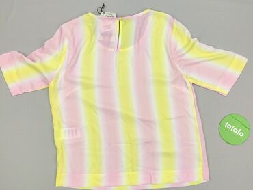 Bluzka damska z krótkim rękawem, oversize/luźny krój. - Wzór: poziome, cieniowane pasy w odcieniach koralowego, różu, moreli i ecru; ramiona z delikatnym ciemnobrązowym akcentem. - Dekolt: okrągł...