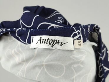 Bluzka damska Pulp by Gemo, rozmiar 46. - Kolor bazowy: granat - Wzór: botaniczny/kwiatowy w odcieniach pomarańczy, fioletu, brązu i bieli - Fason: luźniejszy, z delikatną stójką i rozcięciem pod ...