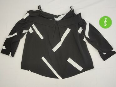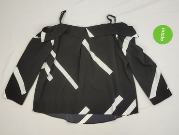 Bluzka damska hiszpanka z prążkowanej dzianiny. - Krój: dopasowany, odkryte ramiona (dekolt typu off-shoulder). - Wzór: czarno-białe, szerokie poziome pasy. - Rękawy: długie; na lewym rękawie trzy ...