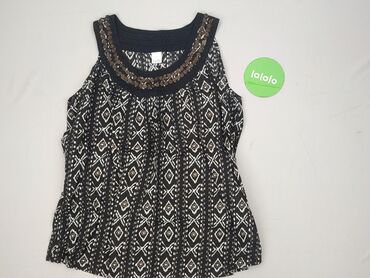 Damska bluzka bez rękawów z lekkiego, zwiewnego materiału. - Kolor: czarny w drobny, nieregularny deseń w odcieniach bieli, beżu i niebieskiego. - Krój: luźny, lekko rozszerzany ku dołowi; okrągł...Stan: