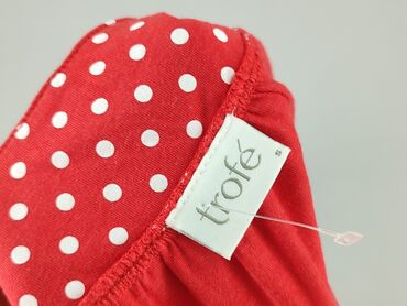 Lekka, czerwona bluzka damska z krótkim rękawem, ozdobiona subtelnym wzorem w kropki. Charakteryzuje się okrągłym dekoltem z falbanką i marszczeniami w górnej części, co nadaje jej swobodny, a zara...