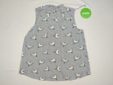Bez rękawówBluzka damska bez rękawów w biało-granatowe paski, ozdobiona wzorem w białe ptaki. Posiada marszczony dekolt z wiązaniem. Idealna na cieplejsze dni, lekka i przewiewna. Pasuje do wielu stylizacji, od codziennych po bardziej eleganckie.