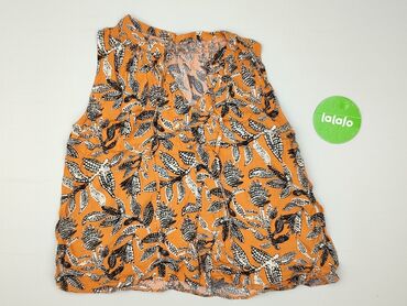 Bluzka damska w odcieniach pomarańczowego, czarnego i beżowego z wzorem liściastym. Posiada okrągły dekolt i jest bez rękawów, co sprawia, że jest lekka i przewiewna. Z tyłu bluzki znajduje się zap...Stan:
