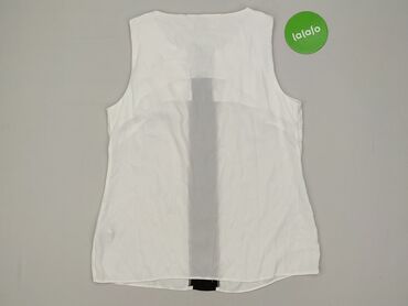 Biała damska bluzka bez rękawów - Krój: prosty, lekko taliowany, z rozcięciem u dołu z przodu i z tyłu - Zapięcie: rząd perełkowych guzików z przodu - Kołnierz: stójka - Materiał: lekki, zwiewny, ...Stan: