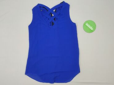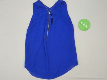 Bez rękawówBluzka bez rękawów w kolorze intensywnego kobaltu. Przód z dekoracyjnym, funkcjonalnym zamkiem błyskawicznym zakończonym brelokiem. Tył z efektownymi krzyżującymi się paskami. Luźny, lejący krój, zaokrąglony dół dłuższy z tyłu. Materiał lekki, zwiewny, o delikatnej fakturze (szyfonowa tkanina/syntetyk). Dekolt w kształcie V. Idealna do stylizacji codziennych i wieczorowych.
