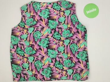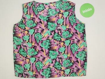 Bez rękawówDamska bluzka bez rękawów z dekoltem w łódkę, ozdobiona wzorem w zielone i fioletowe liście oraz kwiaty na czarnym tle. Krój bluzki jest luźny, co zapewnia komfort noszenia i swobodę ruchów. Idealna na co dzień, na lato lub do stylizacji casualowych. W bardzo dobrym stanie.