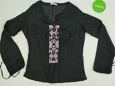 Bluzka damska Blue Collection, rozmiar M. Cienka, przewiewna tkanina w kolorze czarnym. Długi rękaw ze ściągaczem i troczkami przy mankietach. Dekolt w serek z wiązaniem. Z przodu szeroki panel z etnicznym haftem/koralikową aplikacją w odcieniach różu, bieli i czerni, który optycznie wysmukla sylwetkę. Delikatnie taliowany krój, niewielkie rozcięcia po bokach u dołu. Idealna do jeansów i spódnic na co dzień i na letnie wyjścia. Marka: Blue Collection. Rozmiar z metki: M. Kolor: czarny z różowo-białym wzorem. Materiał: lekki, półprzezroczysty (skład z metki niewidoczny). Szczegóły: wiązany dekolt, ozdobny panel, troczki przy rękawach.