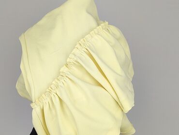 Żółta bluzka damska z krótkim rękawem - Krój: luźny, z lekkim wcięciem w talii i dekoracyjnym wiązaniem z przodu, dół lekko falowany/peplum - Dekolt: łódkowy - Rękawy: krótkie - Materiał: cienka, ...