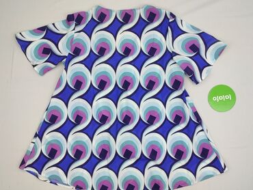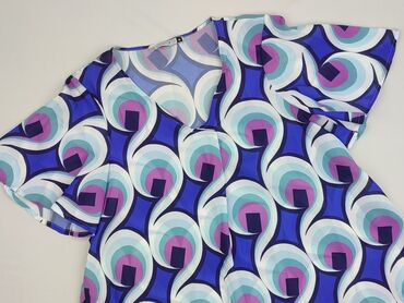 Bluzka damska BEL&BO, rozmiar M. - Kolorystyka: fiolet, pomarańcz, biel; wzór kwiatowo-abstrakcyjny w stylu retro. - Krój: dekolt w serek, lekko dopasowana talia. Krótkie, szerokie, transparentne ...