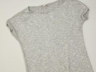 Szara bluzka damska z krótkim rękawem, minimalistyczny krój oversize. - Kolor: jasnoszary melanż - Aplikacja: naszywka z jeansu w kolorze ciemnego turkusu – z jednej strony gwiazda, z drugiej s...