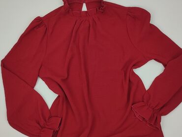 Czerwona bluzka z długim rękawem i falbaną - Fason: prosty, lekko dopasowany - Dekolt: stójka z wycięciem i zapięciem na guzik z tyłu - Rękawy: długie, z marszczeniami na ramionach - Detale: dekor...