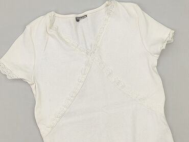Bluzka damska w kolorze białym/ecru z koronkową górą. - Fason: luźny top z krótkim, opadającym rękawem - Dekolt i rękawy wykonane z efektownej, ażurowej koronki o bogatym wzorze - Dół bluzki z gła...