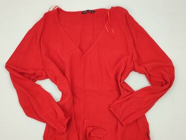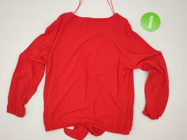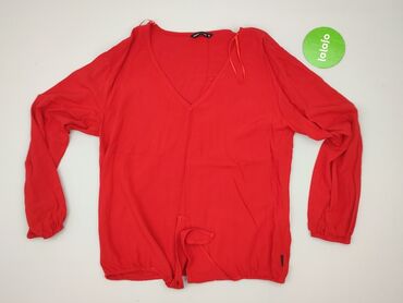 Czerwona bluzka damska z długim rękawem - Fason: luźniejszy krój z dekoltem w kształcie litery V - Rękawy: długie, lekko bufiaste z marszczeniami; mankiety zapinane na ozdobny guzik - Materiał: 50...