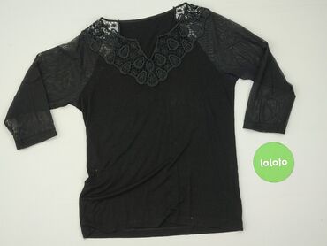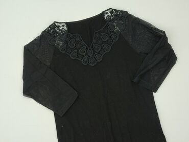 Czarna bluzka damska z ozdobnym panelem z przodu - Rozmiar: M (EUR/US/CA/MX – M) - Fason: luźniejszy, lekko wydłużony tył, rękaw 3/4 - Dekolt: łódka z subtelną lamówką; z tyłu łezka zapinana na gu...