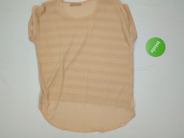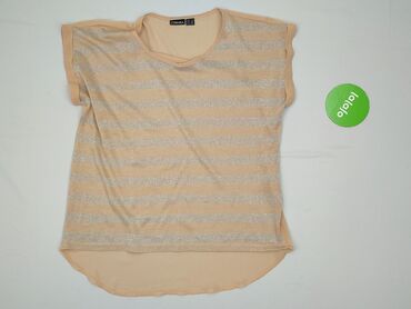 Bluzka damska ESMARA - Fason: luźny top z krótkim rękawem typu kimono, zaokrąglony dekolt - Kolor: beżowy z poziomymi, srebrzystymi pasami z delikatnym połyskiem (front) - Tył: gładki, półtranspar...