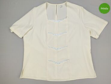 Bluzka damska, kolor: biały, rozmiar: XL. Opis: - Krój z okrągłym dekoltem. - Front zdobiony pionowymi zakładkami (plisami) po obu stronach listwy guzikowej. - Zapięcie z przodu na rząd ozdobnych ...