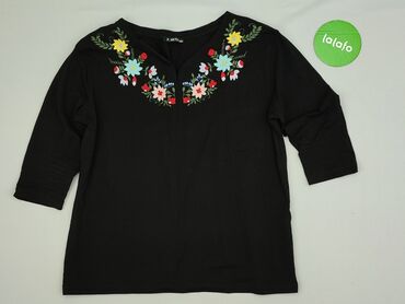 Czarna, lekka bluzka damska z kwiatowym nadrukiem - Wzór: duże, wielobarwne kwiaty (odcienie różu, brzoskwini, zieleni) na czarnym tle - Krój: luźny, przewiewny, z krótkim rękawem; delikatnie zwęż...Stan: