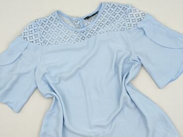 Błękitna koszula/bluzka damska z koronką - Delikatna, jasnoniebieska tkanina - Zapięcie na guziki na całej długości - Krótki rękaw z falbanką - Ozdobne wstawki z koronki z przodu i na plecach - Kl...