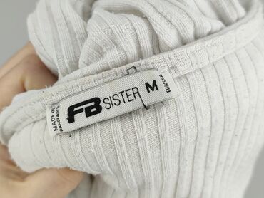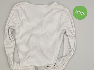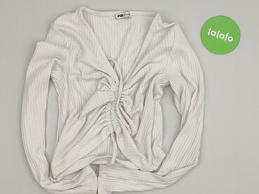 Biała bluzka damska marki FB Sister, w rozmiarze M. Charakteryzuje się dekoltem w kształcie litery V z ozdobnym wiązaniem, które dodaje jej lekkości. Bluzka posiada długie, rozszerzane rękawy, zako...