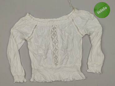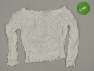 Biała bluzka damska marki FB Sister, w rozmiarze M. Charakteryzuje się dekoltem w kształcie litery V z ozdobnym wiązaniem, które dodaje jej lekkości. Bluzka posiada długie, rozszerzane rękawy, zako...