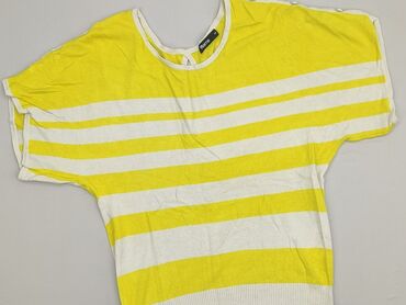 Bluzka damska Flame, rozmiar L. - Krój luźny, z obniżoną linią ramion - Dekolt okrągły z ozdobnym wycięciem z tyłu - Krótkie rękawy; na jednym ramieniu rząd dekoracyjnych guzików - Wzór: żółto-bia...Stan: