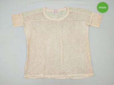 Beżowa bluzka damska z krótkim rękawem typu nietoperz - Rozmiar: XL (metka) - Krój: luźny, z marszczeniem i troczkami na ramionach; delikatne pęknięcia u dołu po bokach - Dekolt: okrągły - Kolor: ...
