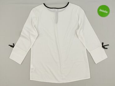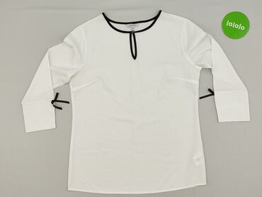 Bluzka damska z długim rękawem, biała z czarnym akcentem przy dekolcie. - Fason: prosty, elegancki, z wiązaniem przy okrągłym dekolcie (czarna lamówka i kokarda). - Rękawy: długie, zakończone szer...Stan: