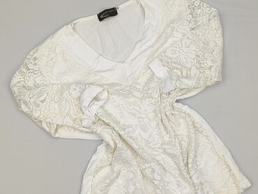 Biała bluzka damska z haftowaną koronką - Krój luźny, lekko oversize - Długość rękawa: 3/4 z delikatną gumką przy mankiecie - Dekolt zaokrąglony - Ozdobne, ażurowe wstawki z koronki biegnące od de...