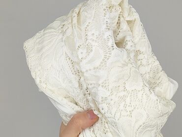 Biała damska koszula z krótkim rękawem, zapinana na guziki. - Fason prosty, lekko luźny, z niewielkimi rozporkami po bokach u dołu. - Ozdobny kołnierzyk z ażurowym, koronkowym wycięciem w kształc...