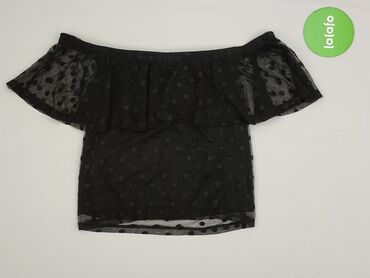 Czarna bluzka damska H&M Divided, model hiszpanka (off-shoulder). - Fason: odkryte ramiona z szeroką, marszczoną gumką u góry; krótkie, falbaniaste rękawy. - Materiał: 95% wiskoza, 5% elastan – mi...