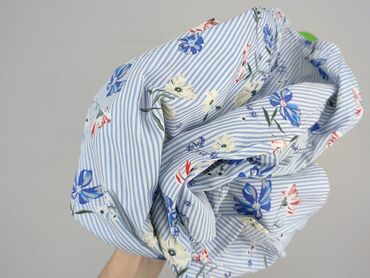 - Wzór: delikatne biało‑niebieskie paseczki z nadrukiem kwiatowym (odcienie niebieskiego, kremu i czerwieni)